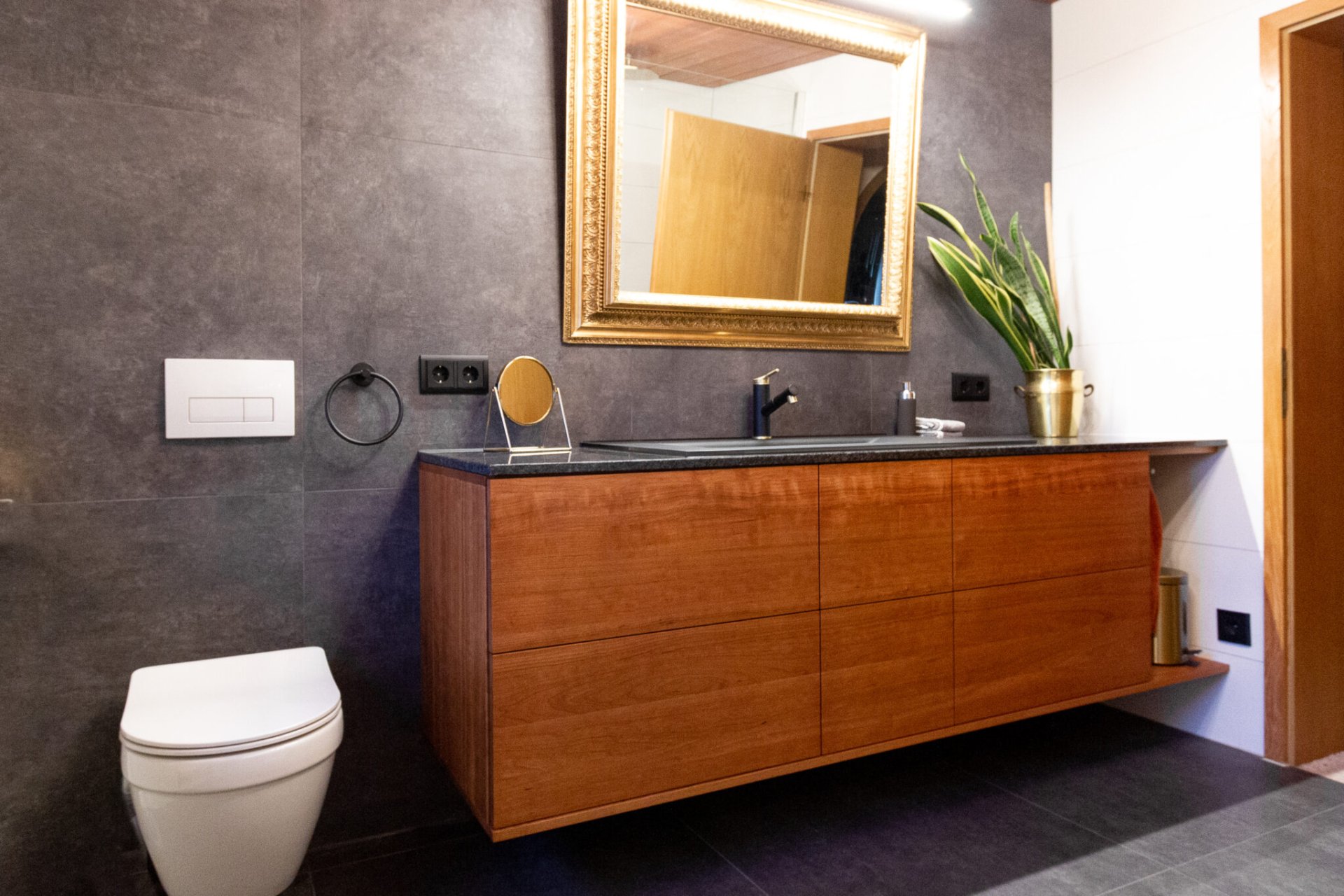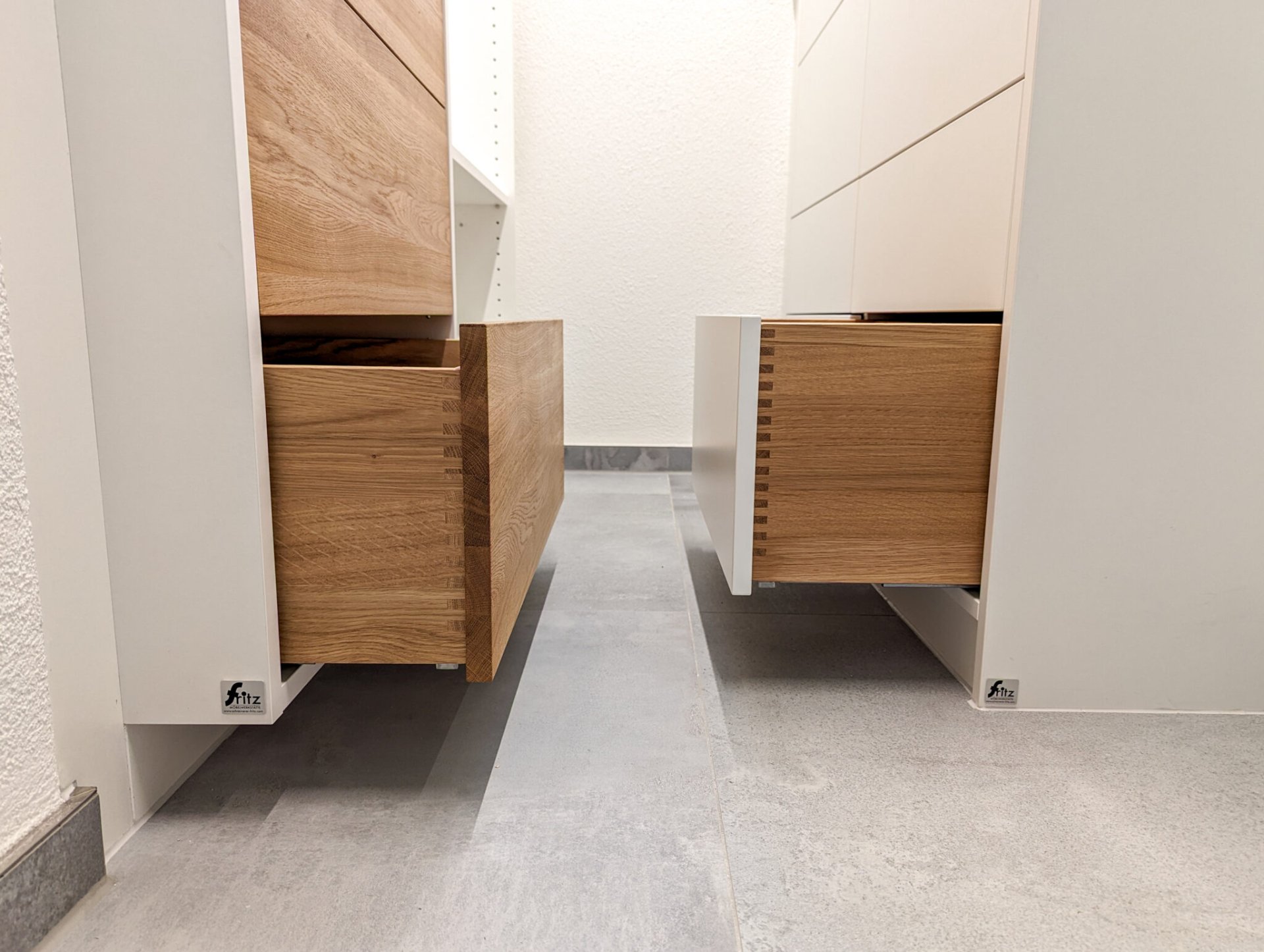 Die Materialien wählen wir sorgfältig – bevorzugt Massivholz mit natürlicher Ausstrahlung und hoher Lebensdauer. Oberflächen, Proportionen und Linienführung sind präzise abgestimmt. So entstehen Räume, die Ruhe ausstrahlen, Ordnung geben und den Alltag leichter machen.